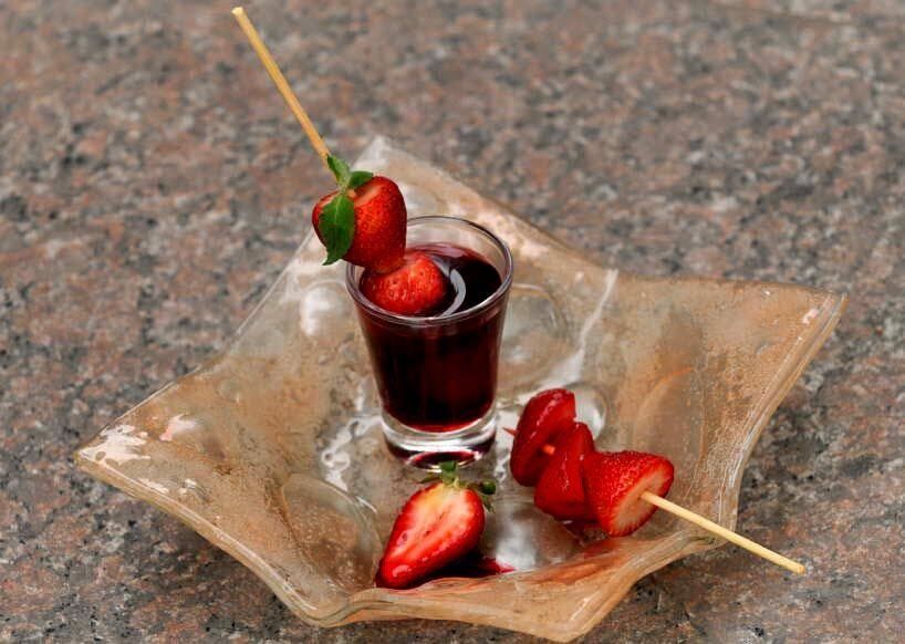 Pincho de frutillas con reducción de malbec y menta