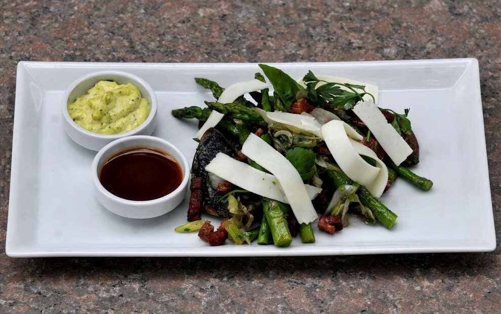 Limpiar los espárragos y blanquear en una olla con agua hirviendo y sal por aproximadamente 1 minuto. Limpiar y cortar los hongos en mitades; cortar la cebolla en juliana; la panceta en cubitos y hacer láminas de queso de cabra con un pela papas. Colocar el sartén al fuego y dorar la panceta. Luego agregar la cebolla, el ajo picado, los hongos y los espárragos. Saltear y desglasar con un poco de vino blanco. Condimentar con sal, pimienta y perejil picado. Servir en un plato y decorar con las láminas de queso de cabra y vinagreta de aceto balsámico, limón y aceite de oliva.
