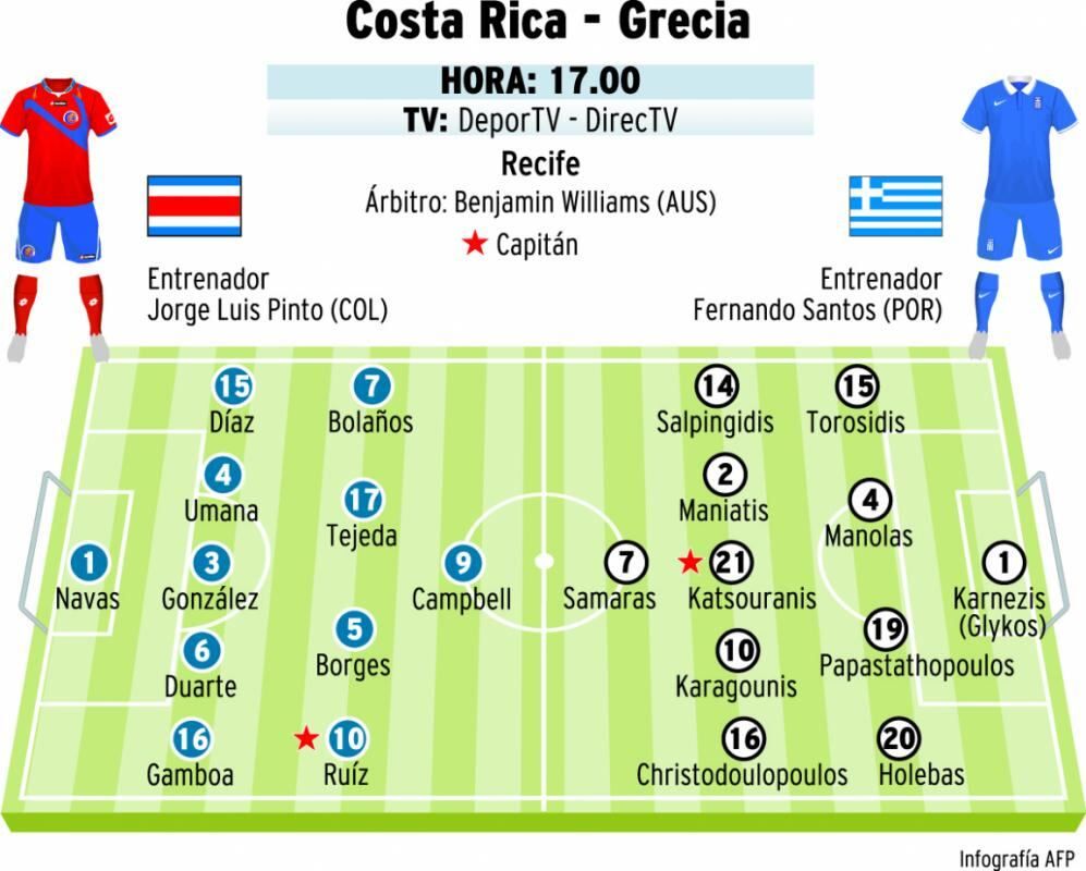 Costa Rica y Grecia, dos de las sorpresas de la primera fase, se enfrentan a las 17 en un duelo inesperado de octavos de final, con el objetivo común de hacer historia en sus países.