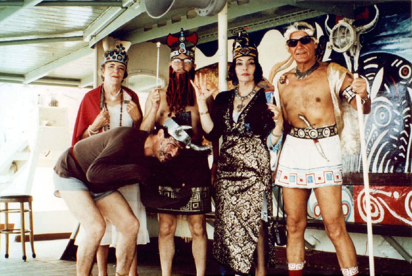 A bordo de un carguero que lo traía de Grecia, en un viaje de 55 días, hizo en broma una versión del Minotauro. Hay una foto histórica: Anteo Silvio Savi, su compañero durante casi cincuenta años, artista plástico, hizo la escenografía y el vestuario con lo que tenían a mano (la barba era de cinta de máquina de escribir, el cuerno de papel de cigarrillo) para una audiencia de perplejos marinos griegos.