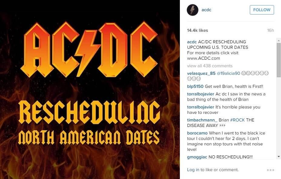 En un comunicado publicado en su sitio oficial, la agrupación informó de los cambios en las fechas para los conciertos que tenían previstos en marzo y abril de su tour mundial "Rock or Bust". También anunciaron la modificación en Instagram.