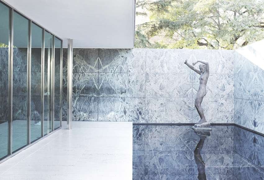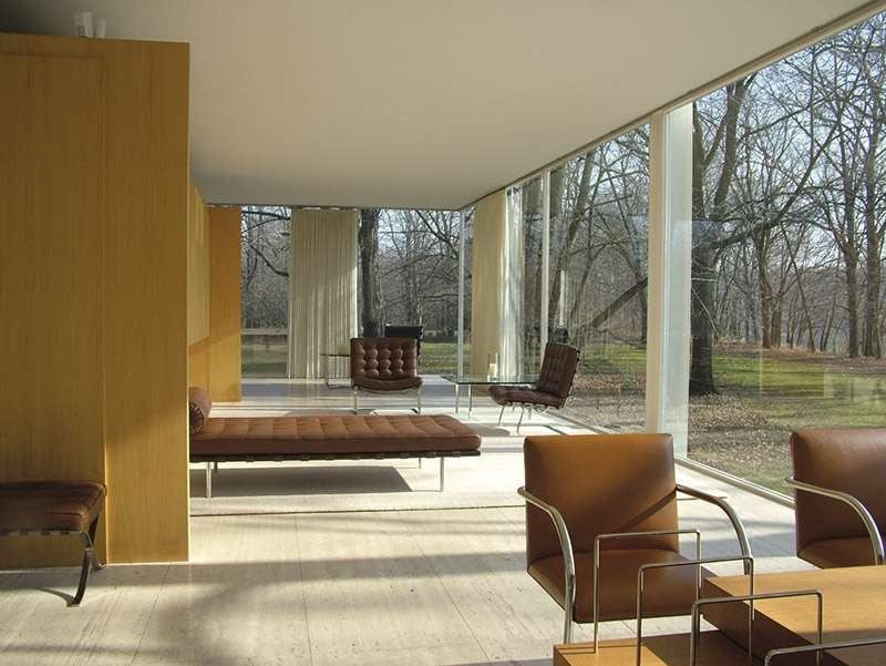 Desde siempre, Mies van der Rohe ha creado los espacios interiores con simpleza, los cuales son diagramados en forma conjunta con la estructura. En la casa Farnsworth, por caso, el esqueleto se lleva hacia el exterior con el fin de liberar el interior y despojarlo. No se advierten elementos estructurales adentro por lo que el espacio interno está conformado por una superficie continua de piso, un núcleo central revestido en madera, las cortinas y el mobiliario.