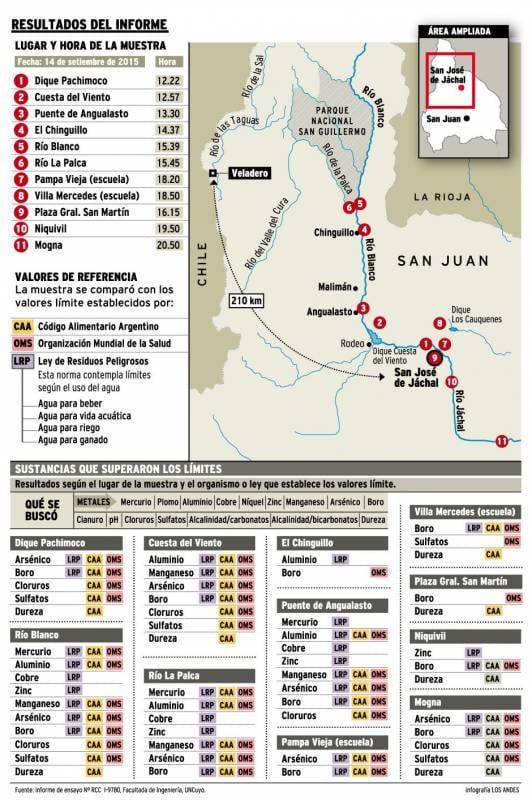 De acuerdo al informe al que Los Andes tuvo acceso, los técnicos tomaron las muestras para estudiar diversos parámetros de calidad del agua y -según la solicitud del municipio de Jáchal- determinar la presencia y niveles de cianuro, mercurio, plomo, aluminio, cobre, níquel, zinc, manganeso, arsénico y boro (metales). También se estudió los niveles de sulfatos y cloruros (sales) y las concentraciones de alcalinidad y dureza total del agua.