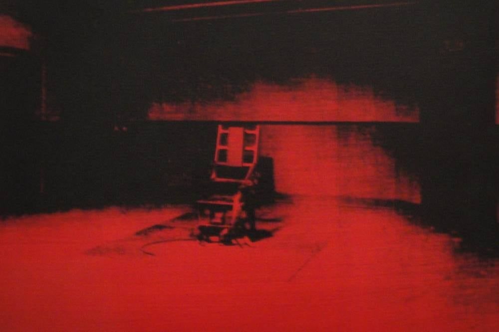 El artista basó su "Little Electric Chair", fechada entre 1964 o 1965, en una foto de la prensa de 1953 de la cámara de muerte de la prisión de Sing Sing en la que Julius y Ethel Rosenberg fueron ejecutados ese año por compartir secretos con la Unión Soviética.