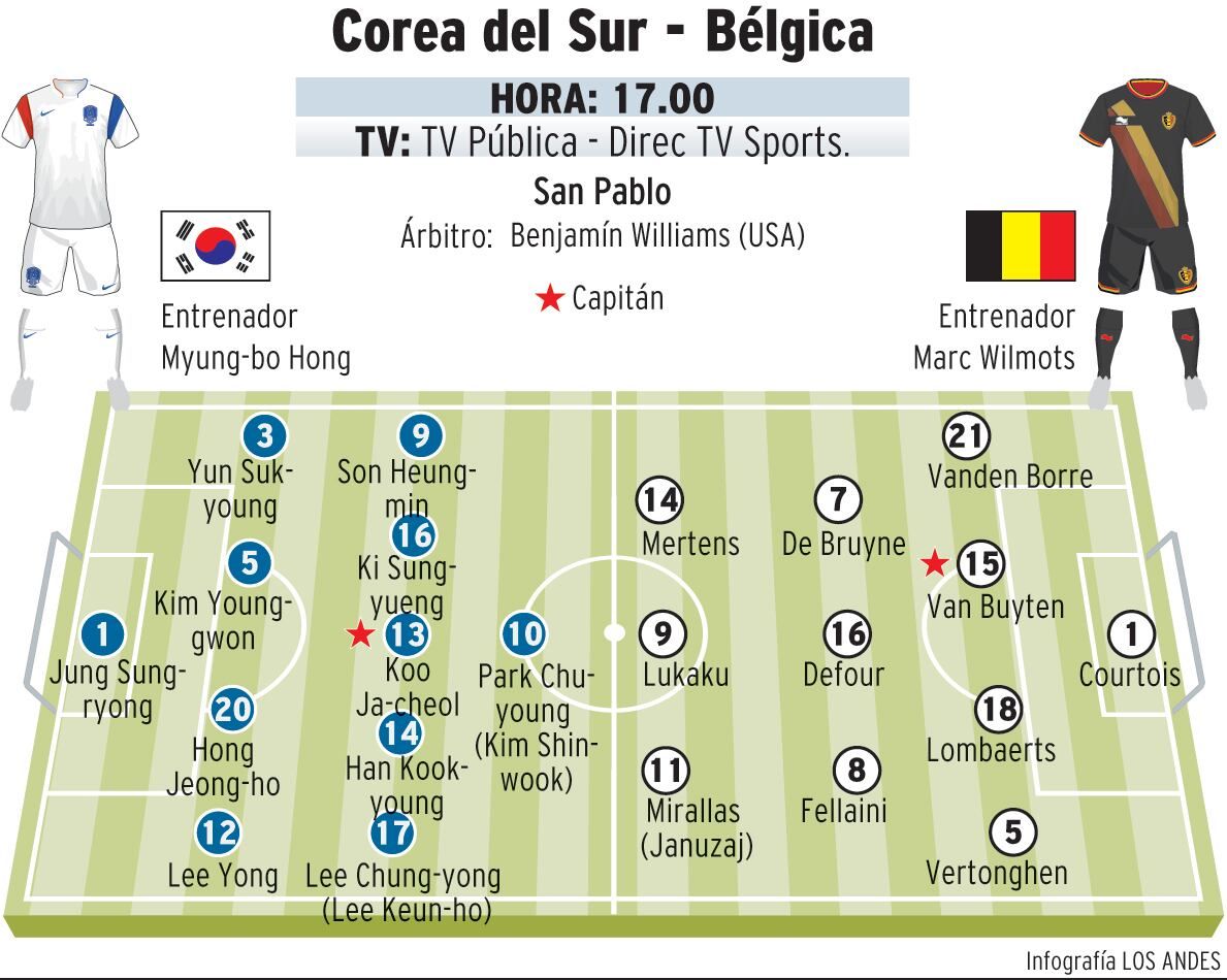 Bélgica, ya clasificada para los octavos de final pero decepcionante desde el punto de vista del juego, pugna por la primera plaza del grupo H, en Sao Paulo frente a Corea del Sur, obligada a ganar si espera continuar su aventura brasileña.