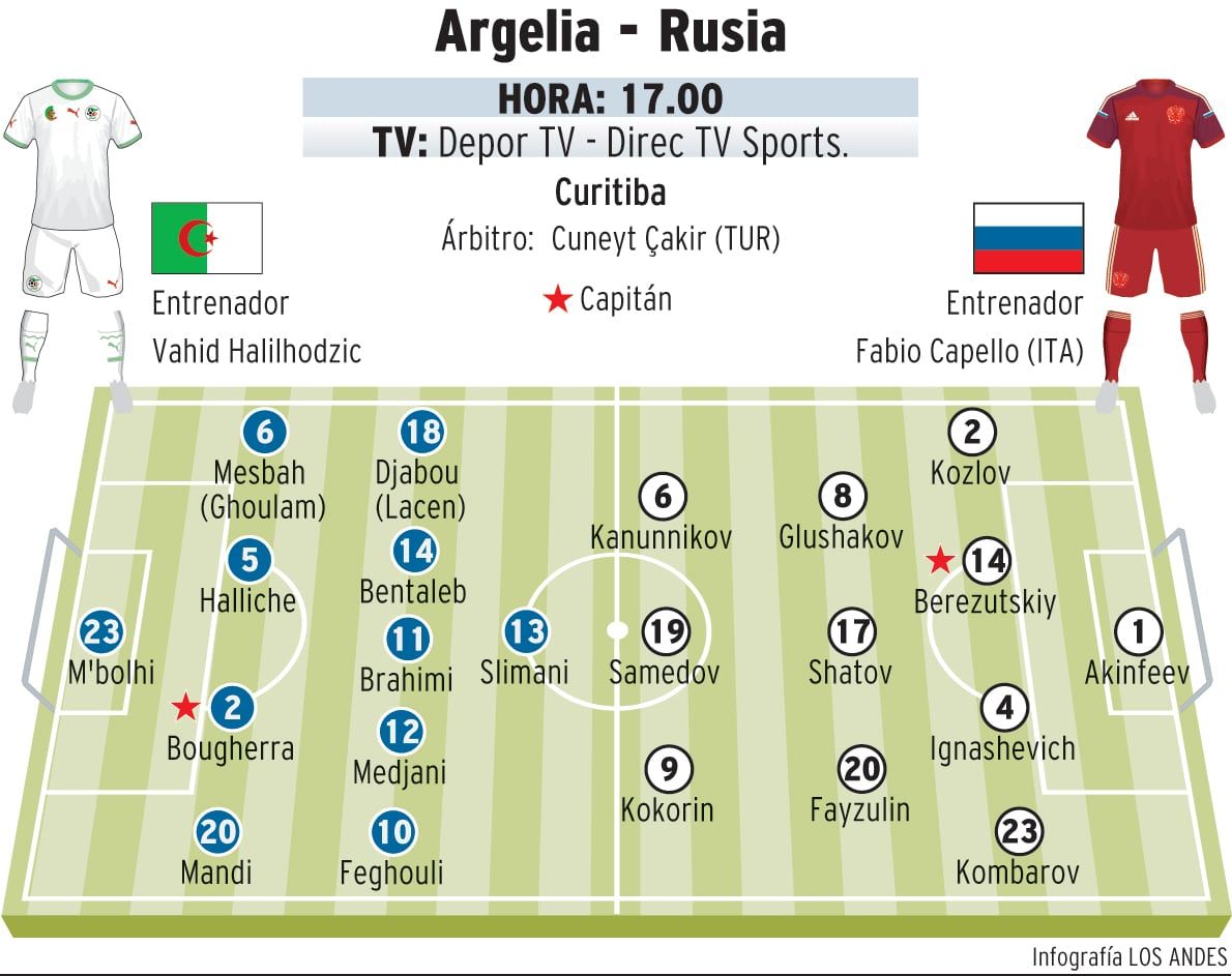 Por su parte, Argelia, que suma tres unidades, luego de la caída 1-2 ante los belgas y un triunfo 4-2 contra los coreanos, cuenta con mayores chances que su rival de turno, Rusia, ya que con un empate podría acceder a la próxima fase, aunque dependerá de que Corea no triunfe ante Bélgica.