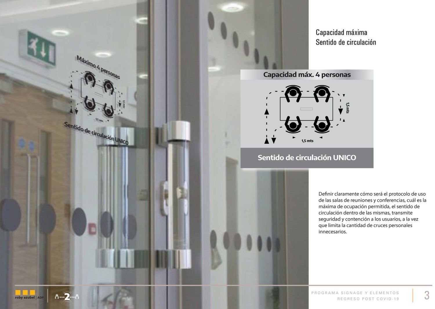 Será común ocupar las salas de reunión con solo la mitad de su capacidad; tal vez el resto de los integrantes pueda sumarse de forma remota si el número de asistentes compromete la distancia física sugerida. También indicar la ruta de entrada y de salida a la misma reduce la probabilidad de cruces entre personas a una distancia menor a la sugerida.