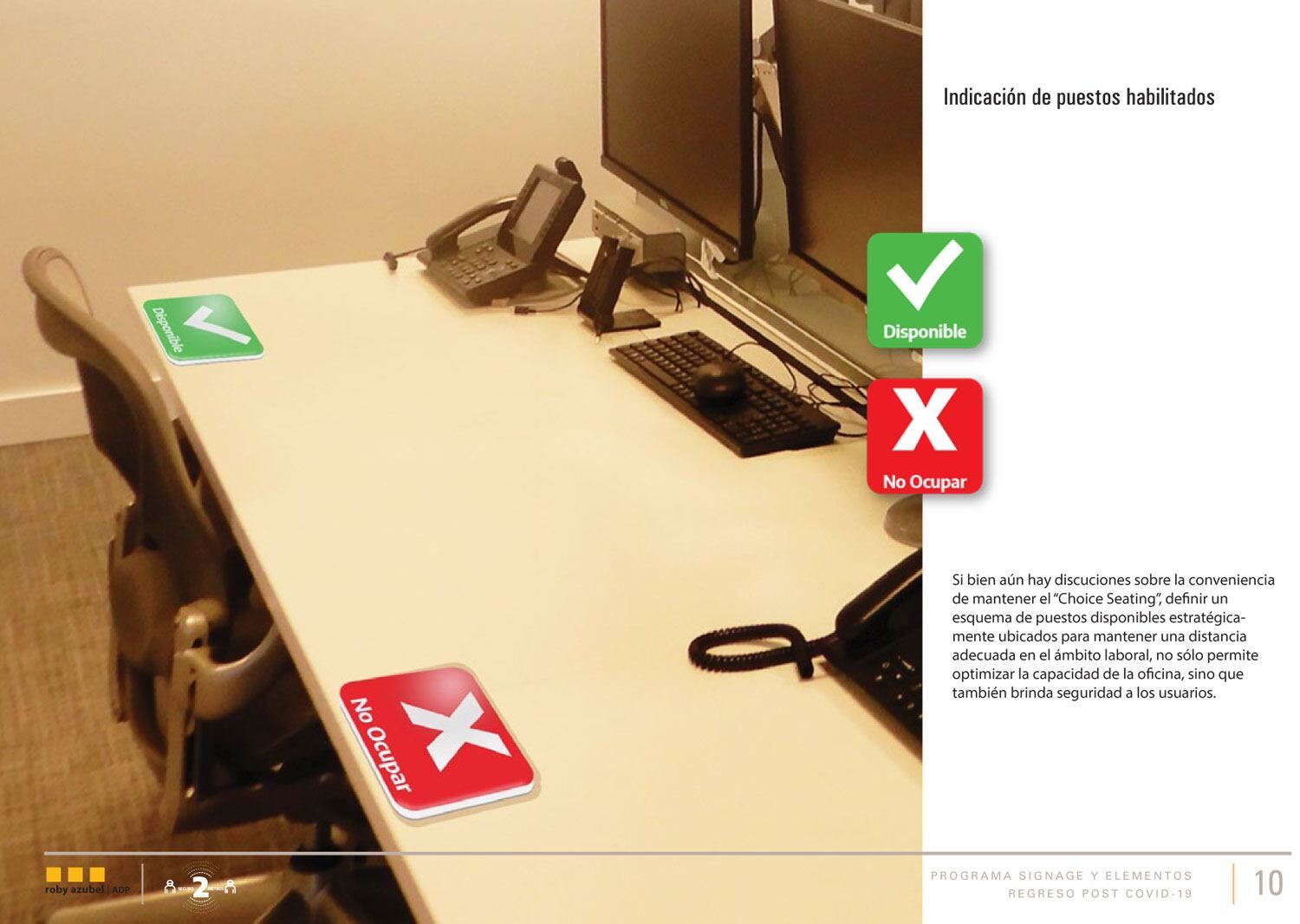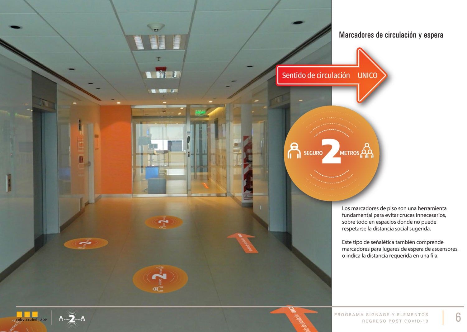 Estos objetivos pueden lograrse de varias formas en los distintos ámbitos, siempre que indiquemos claramente las nuevas disposiciones de ocupación, ubicación, circulación, etc. Sé que me estoy repitiendo, es que en un principio deberá ser obvio, tal vez algo reiterativo y hasta un poco invasivo, y es porque habitualmente el signage nos refiere a conductas conocidas. No está pensado para enseñarnos nuevas habilidades, pero con una consigna clara y tiempo, puede lograrse.