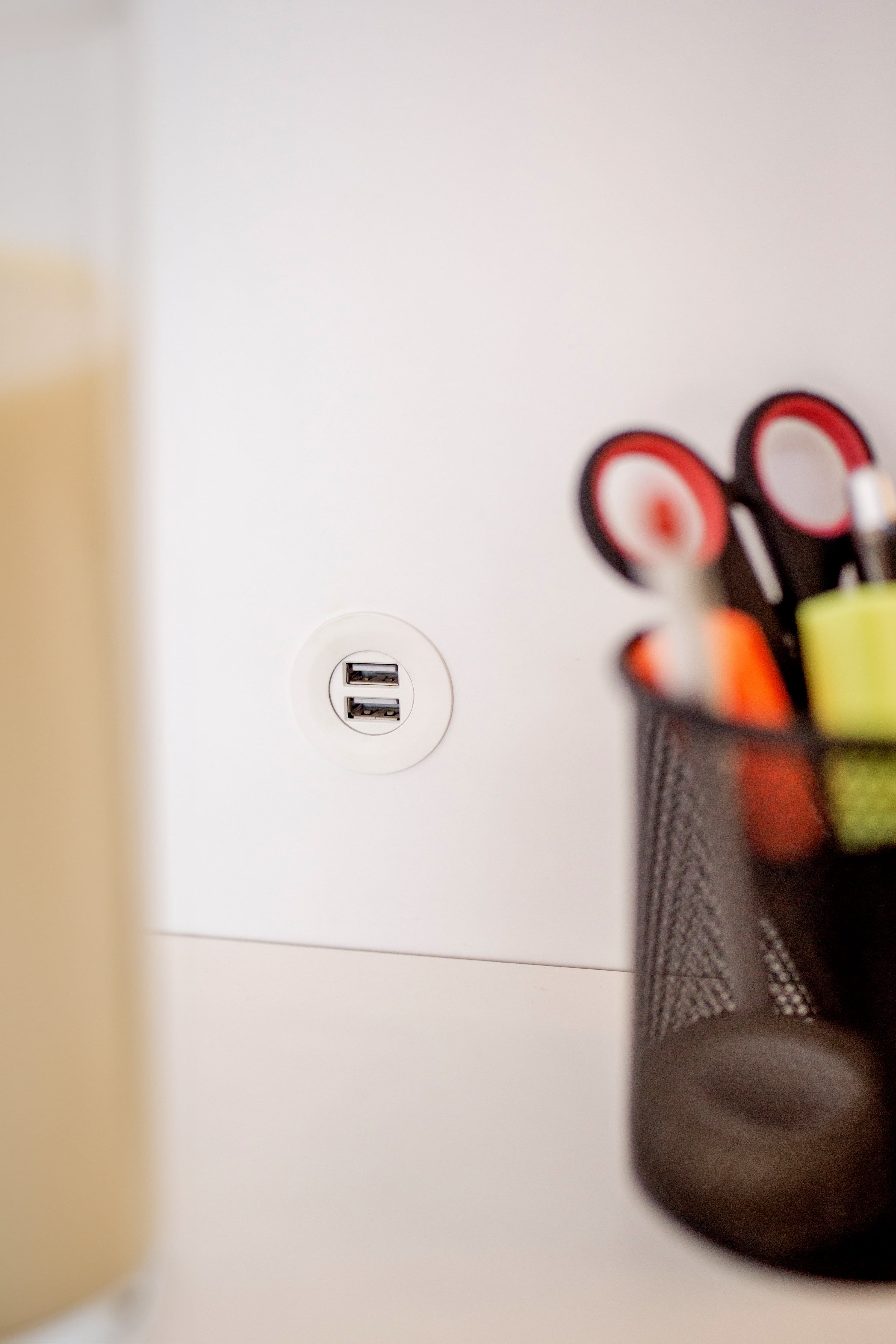 Para los que estudian con computadoras o dispositivos es clave contar con estaciones de carga. Existen enchufes de USB que pueden instalarse en el equipamiento, incluso algunos son por inducción. Y para los que odian los cables a la vista, pueden optar por organizadores de cableado que son guías verticales en forma de espiral que los ordenan y ocultan.