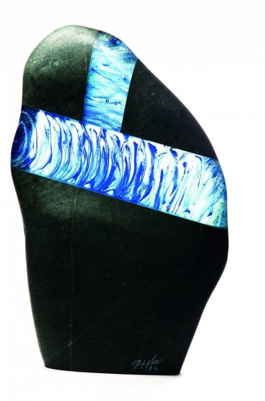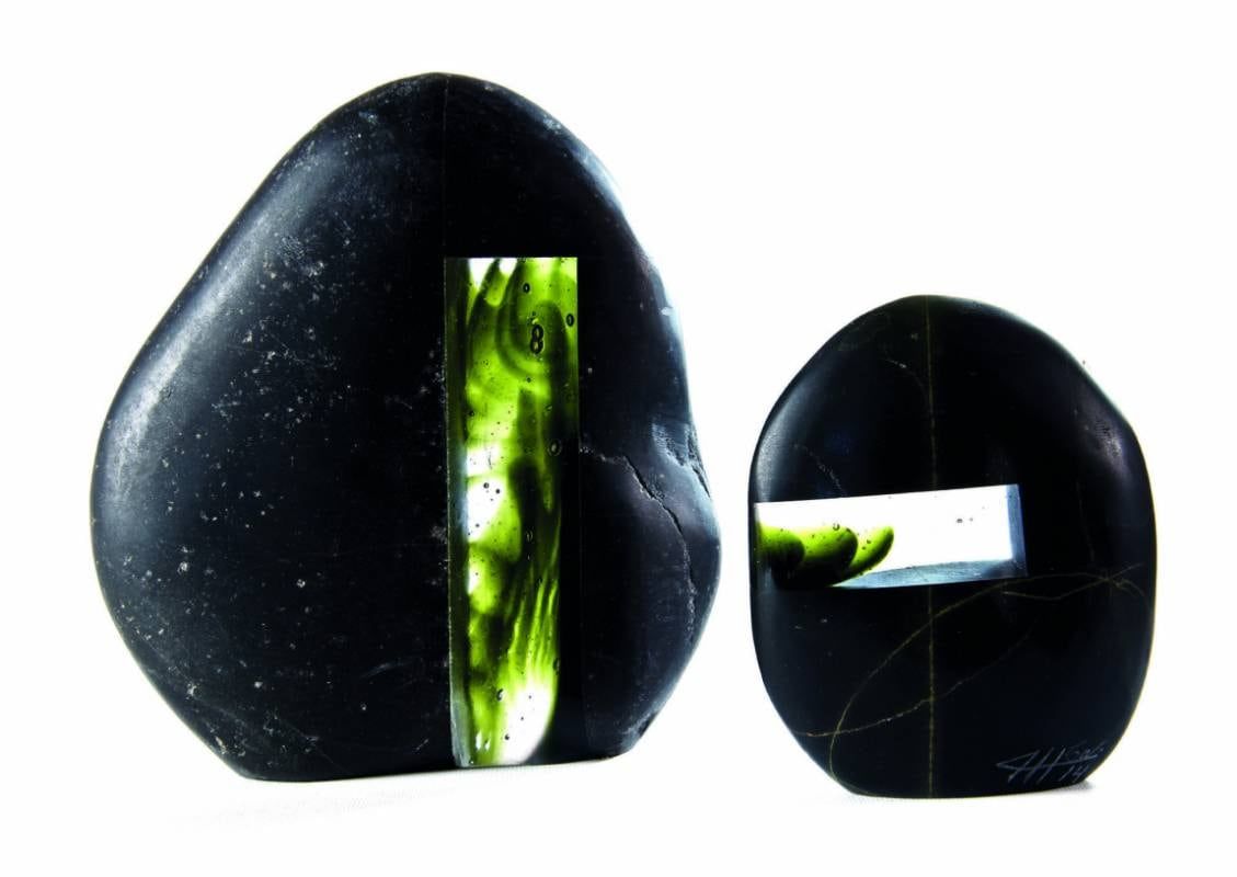 Alejandro Herrera Guiñazú. "Calbuco". Trabajo en frío, Pâte de verre, piedra rodada del Río Mendoza intervenida con vidrio.
