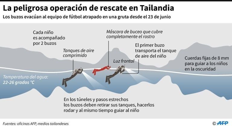 Dos de los rescatados toman antibióticos porque presentan síntomas de neumonía después de días en la humedad de la gruta. Pero incluso ellos tienen un "estado normal", informó el hospital de Chiang Rai, en el norte de Tailandia. Las personas que pasan mucho tiempo bajo tierra suelen sufrir problemas pulmonares.