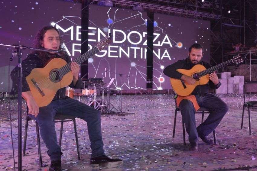 Los guitarristas Leonardo Palma y Exequiel Sandoval iniciaron el momento musical de la noche. El dúo mendocino interpretó a pura cuerda distintas versiones instrumentales; tangos como "Sur", el cancionero folclórico, composiciones de música clásicas, un vals propio, entre otros sonaron durante más de media hora.