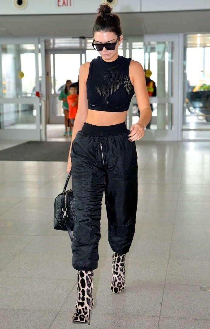 Kendall Jenner, con un equipo negro de crop top (estilo rejilla), pantalón boxing, y botas animal print infartante.
