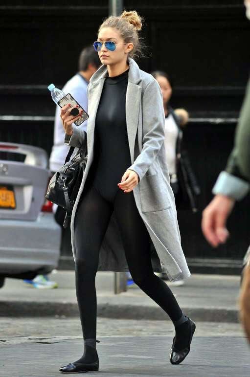Hadid opta por una línea “bailarina” (maillot y medias negras), con zapatillas de ballet. Conjuga la actividad con la formalidad de un maxi tapado de medio tiempo, y cartera formal. Una buena opción para las que se animan a todo.