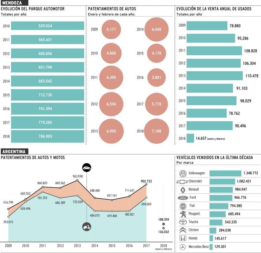 Según datos de la Dnrpa, el parque automotor de Mendoza era de 529.024 vehículos a fines de 2010 (incluye toda clase de rodados). En 2012 ya se habían superado las 600 mil unidades y en 2015 se rompió la barrera de los 700 mil. Hoy hay 786.903 vehículos circulando por la provincia y todo indica que en el transcurso del año se superarán los 800 mil.