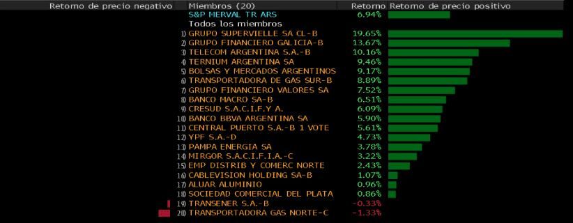 Las acciones de compañías argentinas que cotizan en el mercado estadounidense, american depositary receipts (ADR), también tuvieron un comportamiento positivo. Se destacaron entre las más ganadoras la acción de Banco Superviell, con el 2,72%, Grupo Financiero Galicia con el 11,05% y Transportadora de Gas del Sur con el 8,22%.