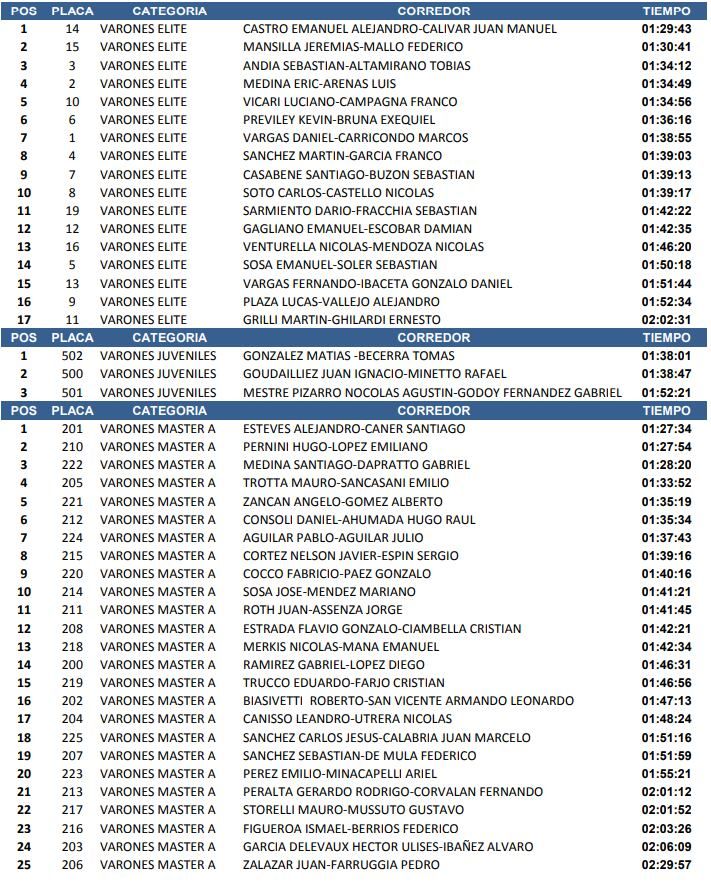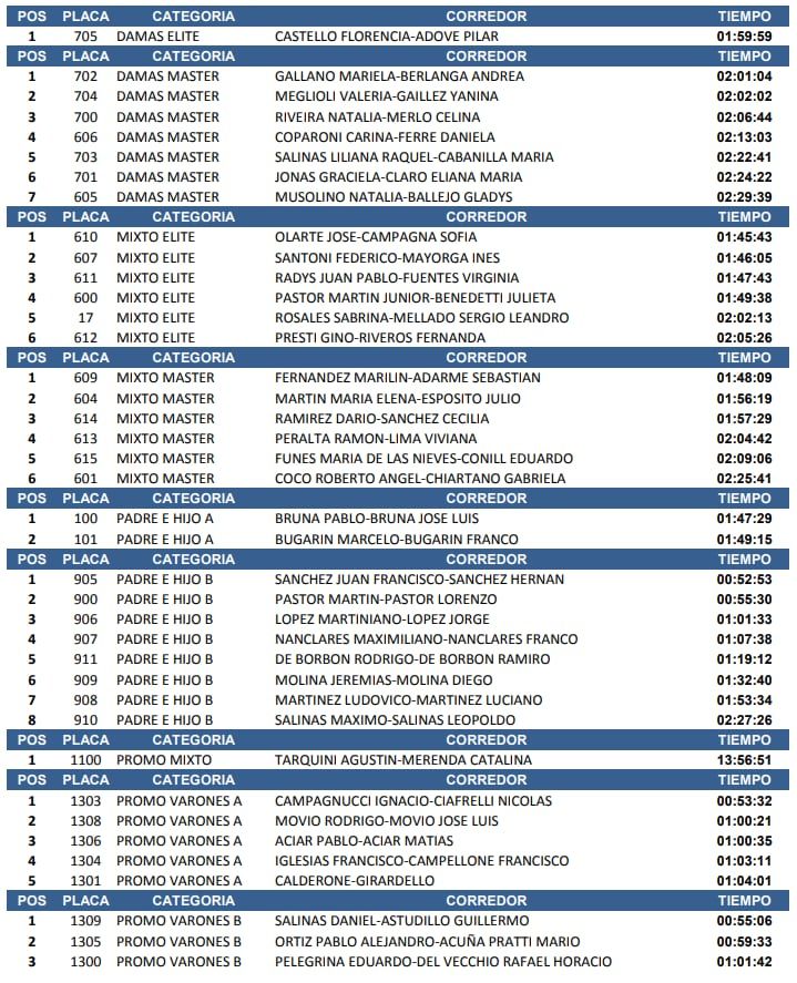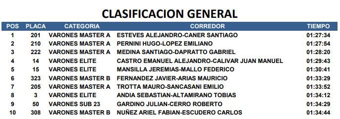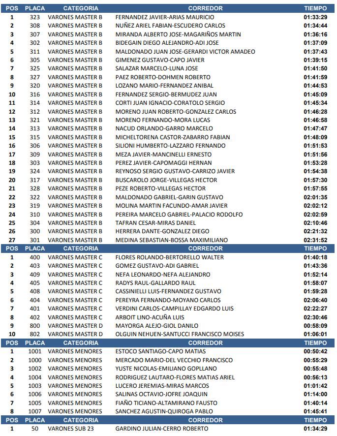 Esta dupla recorrió los 36 kilómetros que tenían los dos circuitos en 1 hora 27", dejando atrás a la pareja formada por Hugo Pernini y Emiliano López.