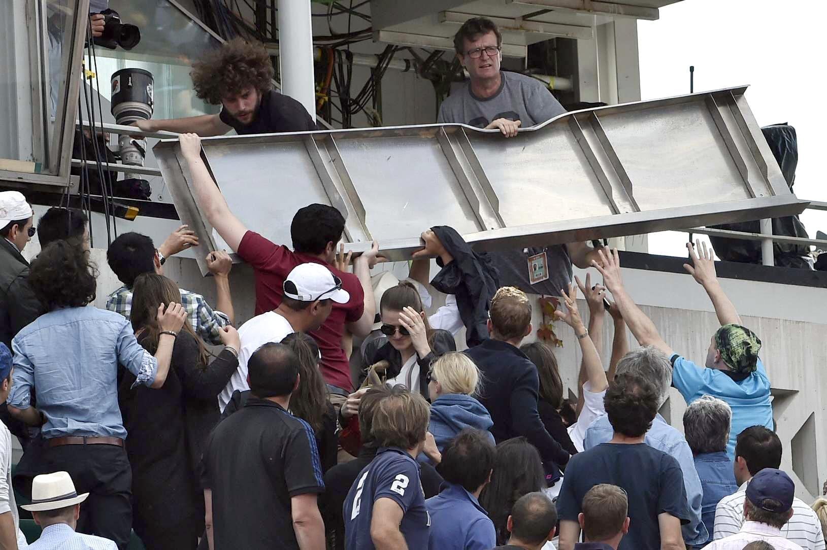 Tres personas sufrieron heridas leves al ser golpeadas porparte de la estructura metálica que se desprendió de un panel del marcador y cayó sobre una de las tribunas del estadio Philippe Chatrier, el principal de Roland Garros, durante el encuentro de cuartos de final entre Jo-Wilfried Tsonga y Kei Nishikori, señaló la Federación Francesa de Tenis (FFT).