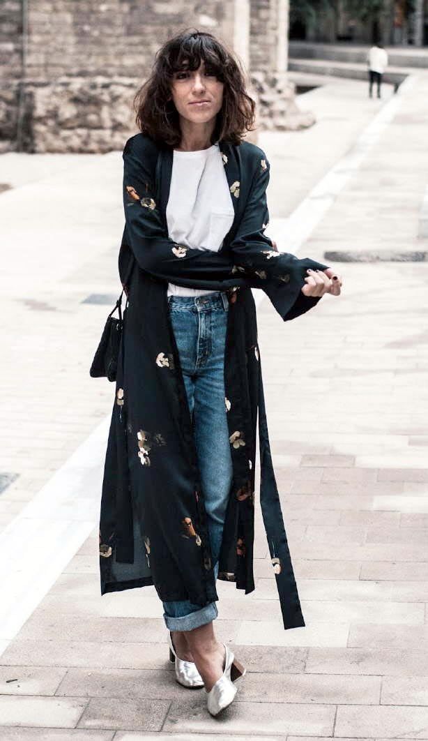 1. Onda street style con aire desestructurado. Un look que levanta la simpleza de un jean boyfriend con una remera básica blanca, de la mano de esta bata larga. En este caso la textura en satén estampado, sumado a unos zapatos en metalizado imprimen un toque chic al outfit.