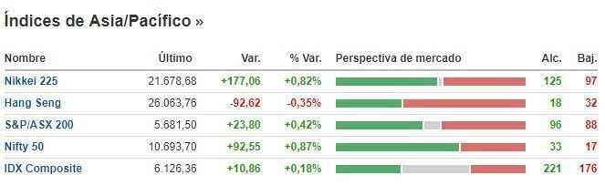 En tanto, el índice Hang Seng de Hong Kong fue el único que desentonó con un rojo de 0,35%.