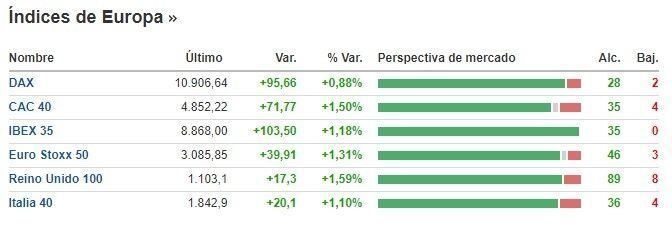 El que más sube es el Reino Unido 100, que avanza a 1,59%; mientras el más rezagado por ahora es el Dax alemán que gana un magro 0,88%.