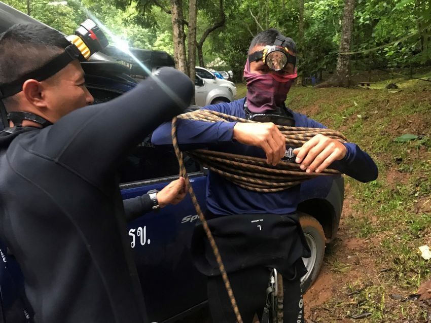 Around a dozen navy SEAL divers and other rescuers re-enter a cave in northern Thailand to search for 12 boys and their football coach who have been trapped in a flooded cave since the weekend pic.twitter.com/wlDmtdFYa9