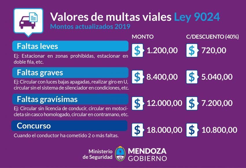 En tanto que las multas graves rondan los $8.400 (con el descuento $5.040), y algunos casos son circular con las luces bajas apagadas y realizar un giro en U.