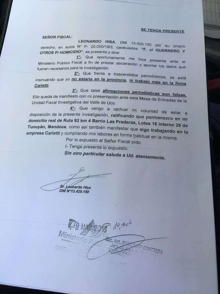 "Vengo a ratificar mi voluntad de estar a disposición de la presente investigación, ratificando que permanezco en mi domicilio real de Ruta 92 km 4 barrio Las Praderas, Lotes 16 interno 29 de Tunuyán, Mendoza, así como también manifestar que sigo trabajando en la empresa Carleti y cumpliendo mis labores en forma habitual en le misma", concluyó el ex esposo de Norma.