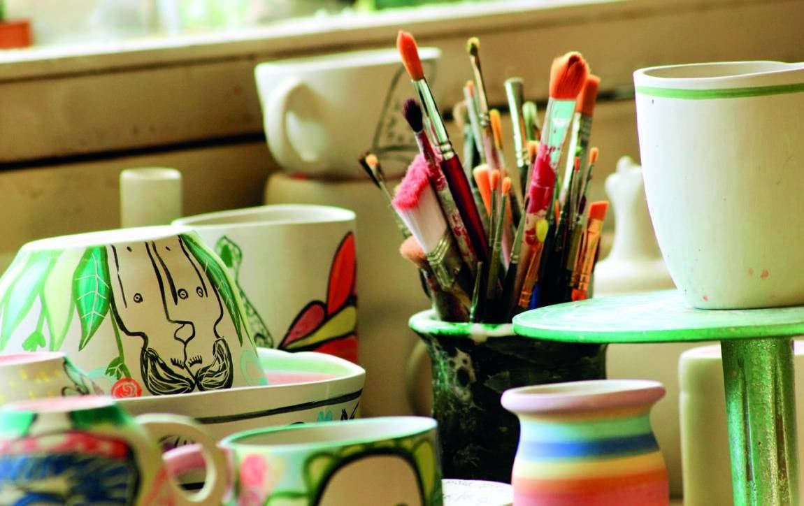 En el taller, algunos objetos en cerámica esperando ser intervenidos junto a los pinceles que le van a dar vida y color a estas nuevas piezas.