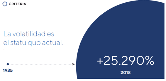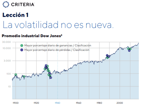 El primer punto que destacan en el informe de Criteria es que la volatilidad no es un fenómeno nuevo, sino que más bien, es tan antigua como el propio mercado bursátil. “Si observamos los cambios históricos en el promedio industrial Dow Jones, veremos que muchos de los mayores cambios se produjeron hace más de 80 años.