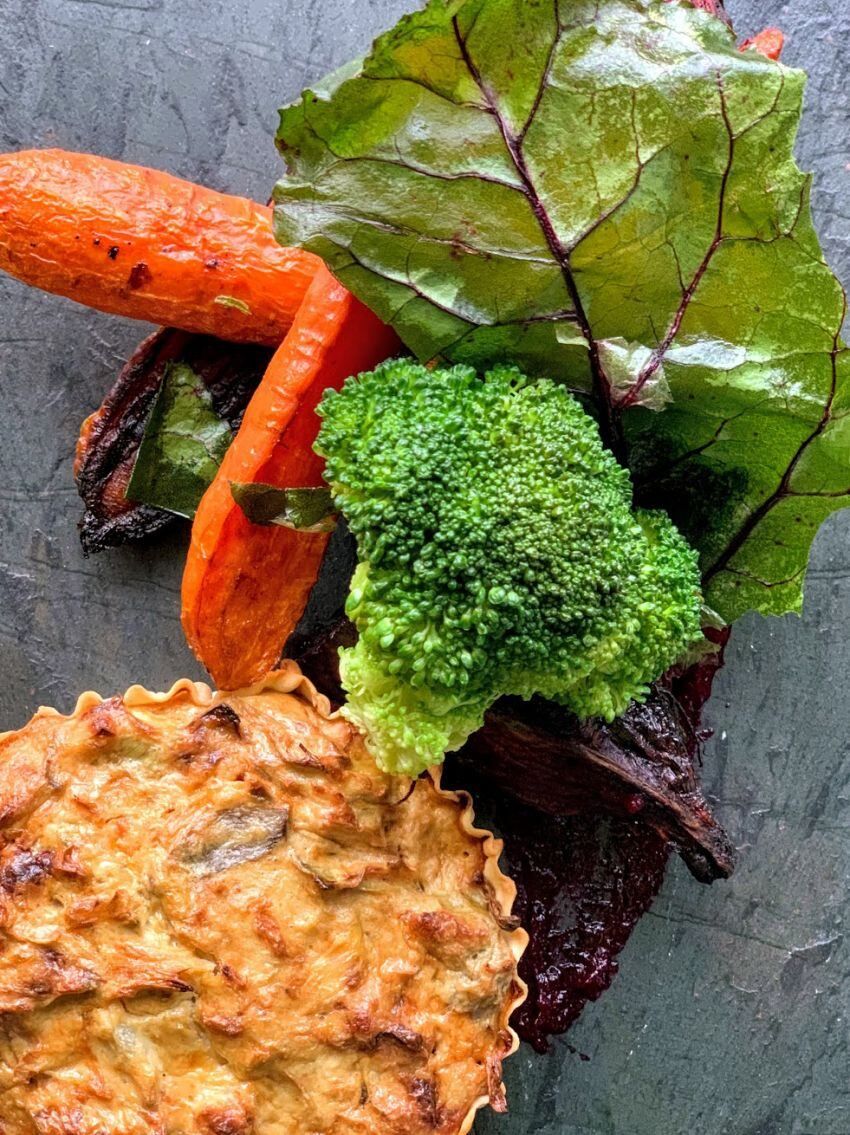 El quiche de alcauciles, con verduras asadas y emulsión de remolachas; se puede acompañar con jugo natural o un vino orgánico, o biodinámico o con cerveza.