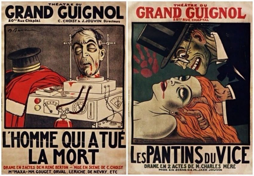 Históricamente, el Grand Guignol fue un estilo de teatro provocador fundado en París en 1897 por el autor y director Oscar Métenier. Sus elementos típicos eran la caracterización de los actores con las extremidades mutiladas y los ojos arrancados, y unos argumentos que culminaban en venganzas espantosas. Y sí: una especie de precedente teatral del cine gore, ese que explota lo visceral y la violencia extrema.