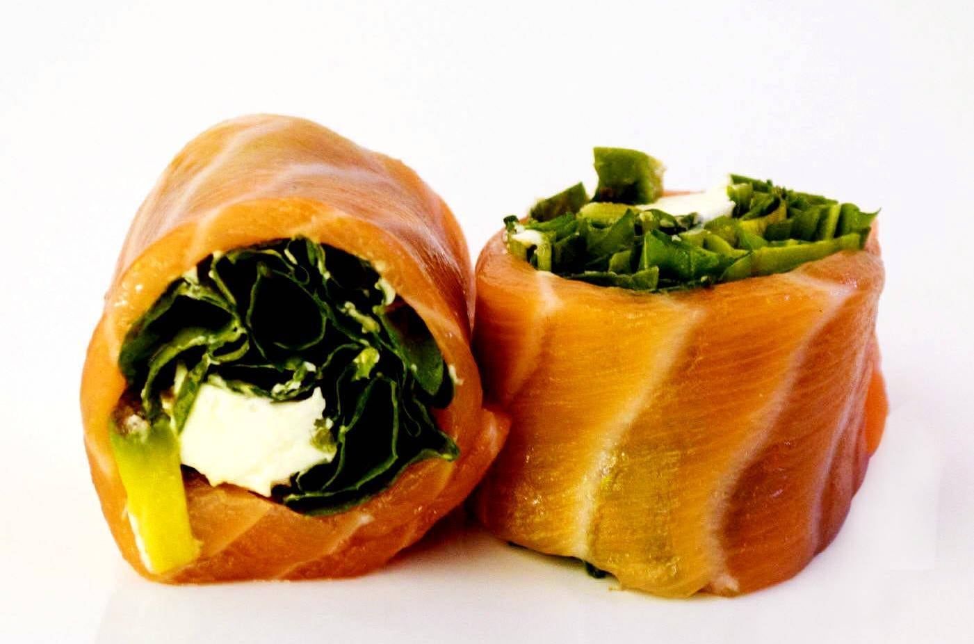 Posteriormente, poner sobre la esterilla como si fuera un alga nori, y en el medio colocar abundante rúcula (tener en cuenta que cuando apretemos el salmón, la rúcula se reduce). Sobre ésta, colocar una tira de queso Philadelphia y una tira de palta. Luego, enrollar -siempre apretando fuerte pero sin romper el salmón-. Una vez listo el roll, cortarlo en 6 piezas y servir acompañado de salsa de soja y wasabi.
