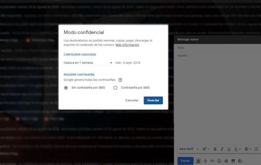 Simplemente, al redactar el mensaje saldrán las opciones de configuración del “modo confidencial”, donde se podrá establecer el vencimiento a gusto de cada usuario. Tras definir la contraseña, luego se presiona “Guardar” y quedará listo.