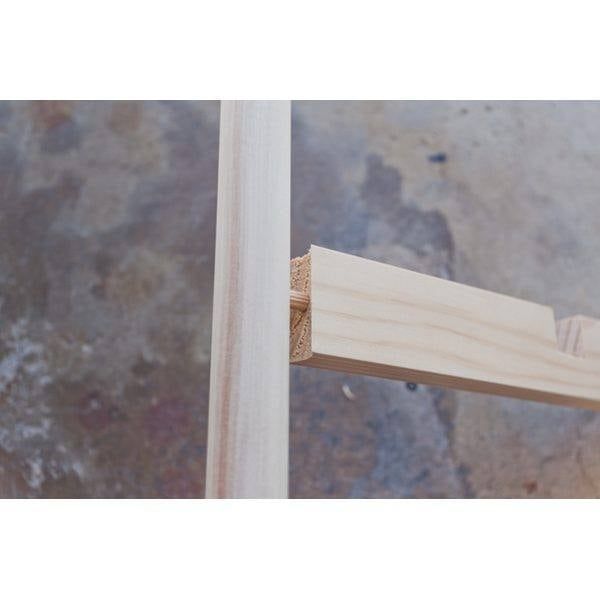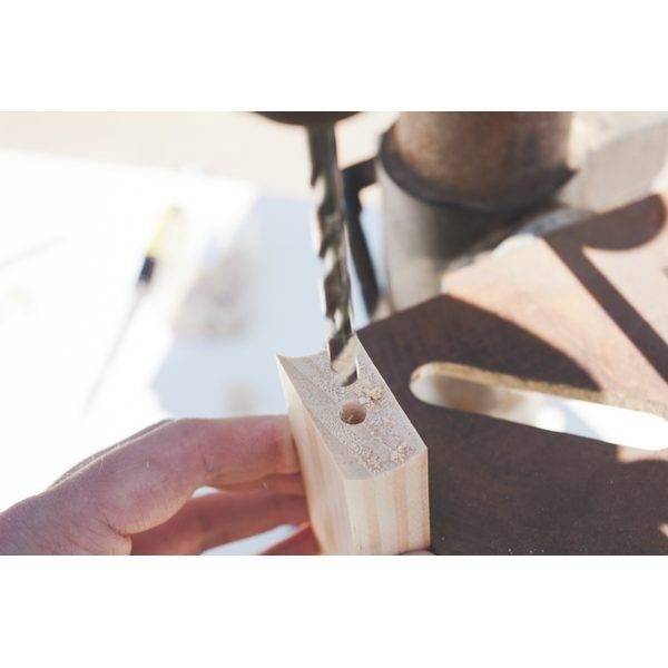 5. Con una agujereadora, hacer un agujero a 20 cm por encima del extremo inferior de cada pata, procurando no llegar hacia el otro lado de la madera.