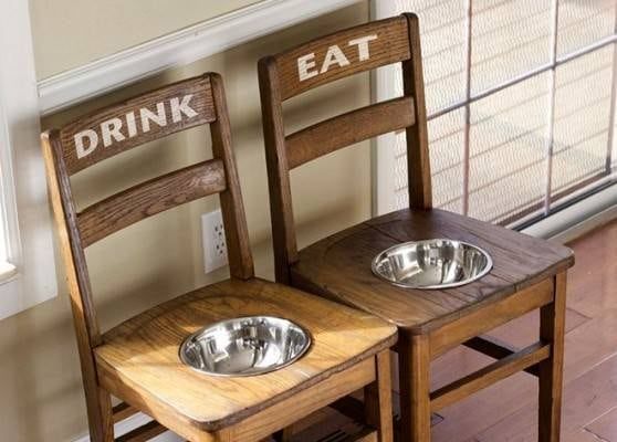 Esta quizás sea la idea más original para reciclar sillas. Como mínimo la más inesperada. Seguro que hay muchos perros mimados que se sientan en una silla de la mesa mientras sus amos comen. Seguro que algunos incluso tienen su propio plato en la mesa. Pero deben de ser muy pocos los que coman y beban en sillas reutilizadas. Sin duda es una buena idea para que los recipientes del agua y la comida del perro sirvan de decoración.