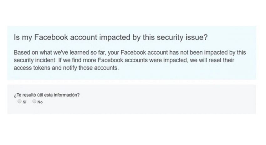 Sólo hace falta loguearte con tu perfil y te enterarás si fuiste impactado por el fallo de seguridad. Este es uno de los mensajes que puede aparecer: "Según lo que hemos analizado hasta ahora, tu cuenta de Facebook no se ha visto afectada por este incidente de seguridad. Si descubrimos que más cuentas de Facebook se vieron afectadas, restableceremos sus tokens de acceso y los notificaremos".