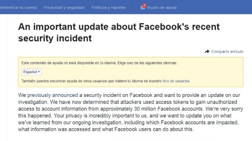 Facebook admitió que 30 millones de cuentas fueron afectadas por una vulnerabilidad, algo que dejó expuestos a los usuarios a hackers.