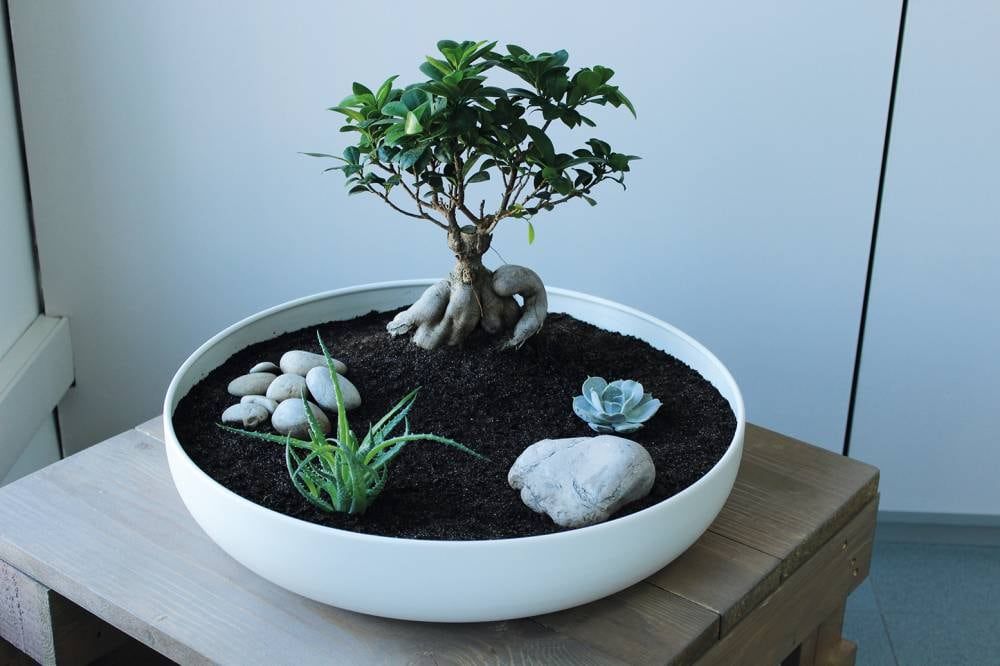 En segundo lugar y en función del contenedor, pensaremos y diseñaremos ese espacio a escala. Tendremos en cuenta el estilo y aquellos elementos que deseamos incorporar. En muchos de los casos es recomendable incorporar un árbol (puede ser un bonsái) o alguna planta del tipo crasa (hojas carnosas) que lo represente. También es posible agregar plantas pequeñas que simbolicen arbustos y, finalmente, el musgo que hará las veces del césped.