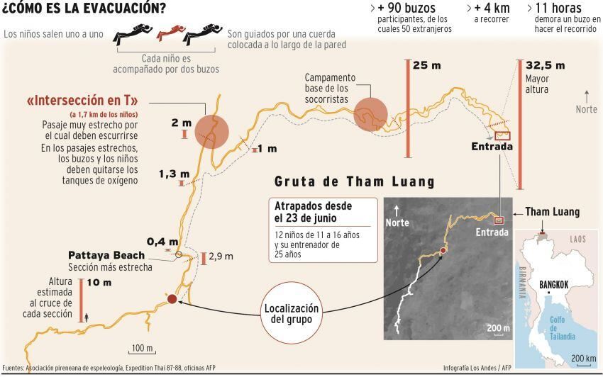 “El pasaje, muy estrecho, sube y luego baja” y requiere contorsionarse, explicó el 2 de julio Narongsak Osottanakorn, el jefe de la célula de crisis.