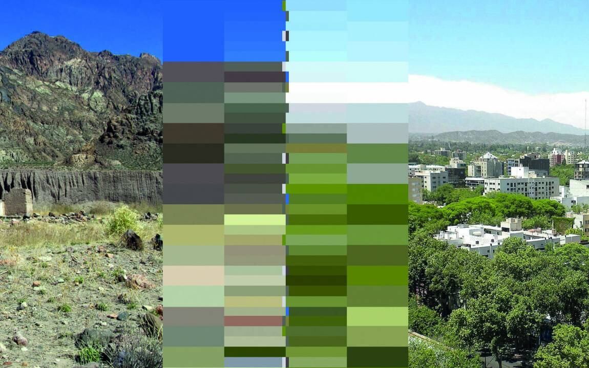 Observando los colores de nuestro alrededor podemos construir una paleta de colores y recrear un paisaje abstracto también. Si nos trasladamos a la ciudad de Mendoza vemos que especies vegetales y sus colores son diferentes a los de la pre cordillera incluso los del piedemonte. Claro, la condición de ciudad oasis da cuenta de una situación y condición diferente.