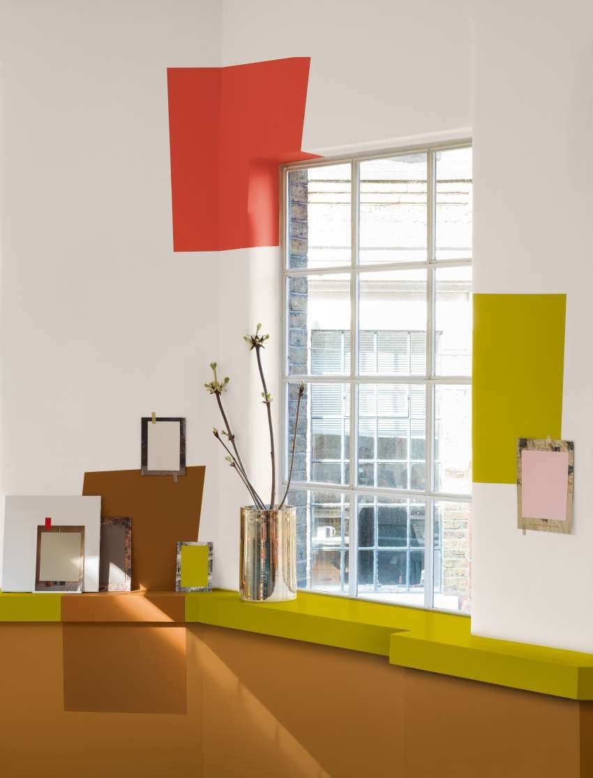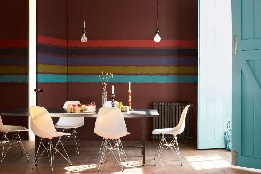 Si se quiere un diseño de pared completa, los rectángulos en diferentes niveles y tamaños, combinando tonos vivos que llaman la atención como naranjas, amarillos, verdes, con paletas más pálidas como los rosados. Otra opción pueden ser algunas líneas horizontales que se complementen con el tono de la pared de base.