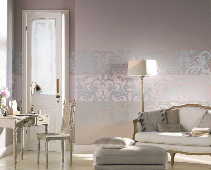 Si queremos una impronta romántica que abarque todo el ambiente, una gran combinación es pintar el total de la pared en dos tonos, agregándole una estampa con arabescos que forman dibujos, similares al entramado del encaje.