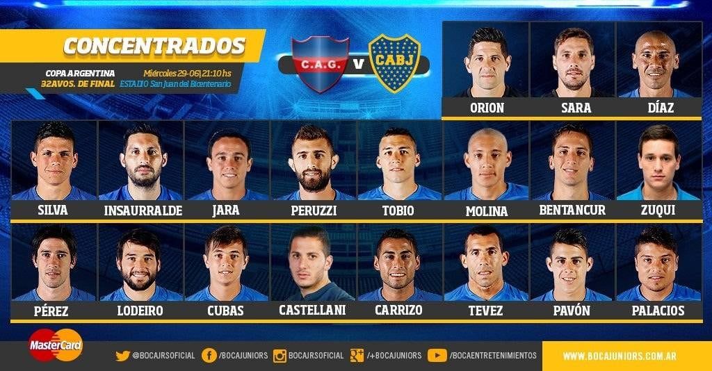 De los flamantes refuerzos, sólo aparece Zuqui, el ex-mediocampista de Godoy Cruz. Dario Benedetto no puede jugar este partido porque el TMS todavía está cerrado para la Copa. Los otros ausentes serán Andrés Chávez, quien sintió una molestia en el isquiotibial y lo cuidarán para los duelos de la Libertadores; Marcelo Meli, que continúa recuperándose del esguince en su rodilla derecha; y Frank Fabra, que aún debe reincorporarse tras disputar el tercer puesto de la Copa América Centenario con Colombia.