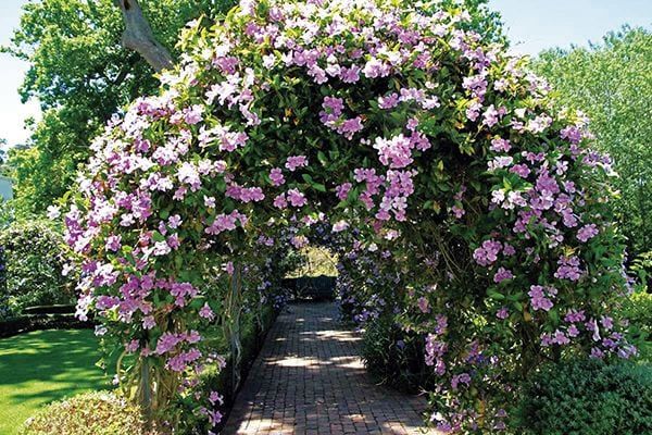 Esta enredadera vigorosa y de crecimiento rápido es ideal para cubrir pérgolas y muros en los cuales necesitará de una estructura de soporte. Prefiere el sol y suelos con buen drenaje, pero se adapta a otras condiciones de cultivo. Florece abundantemente a finales de verano y otoño.