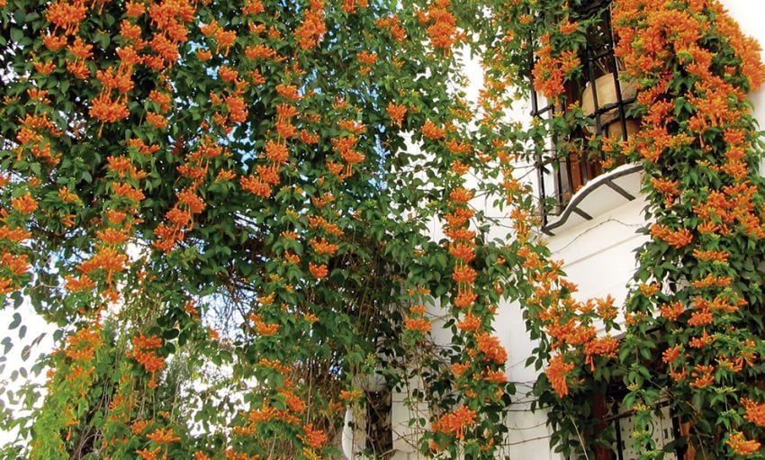 La Bignonia de invierno florece abundantemente desde mediados de otoño hasta finales de invierno. Por sus flores con forma de tubo de color naranja recibe el nombre de "trompetero naranja".