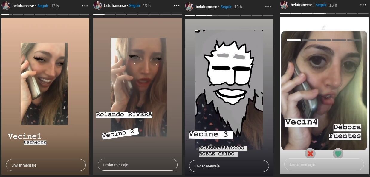 Lo cierto es que ahora ella está curada del coronavirus y mucho más tranquila, razón por la cual está más activa en las redes sociales y se divierte con grabaciones y filtros. Esta vez, eligió realizar parodias de lo que podrían haber sido las conversaciones entre sus vecinos.