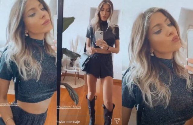 En las historias de Instagram, la hija del ex futbolista de la Selección Argentina, se filmó frente al espejo con un vestuario total black que enamoró a todos. Cande luce un mini short, una remera transparente con corpiño del mismo color, bucaneras y cartera. Cada una de las prendas tienen delicados brillos que le dieron el toque de glamour a la joven.
