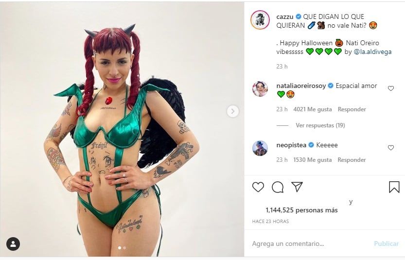 “Que digan lo que quieran. Happy Halloween. Nati Oreiro vibesssss”, publicó la cantante. Sus fanáticos la llenaron de elogios por su escultural figura, además de asombrarse por el parecido.