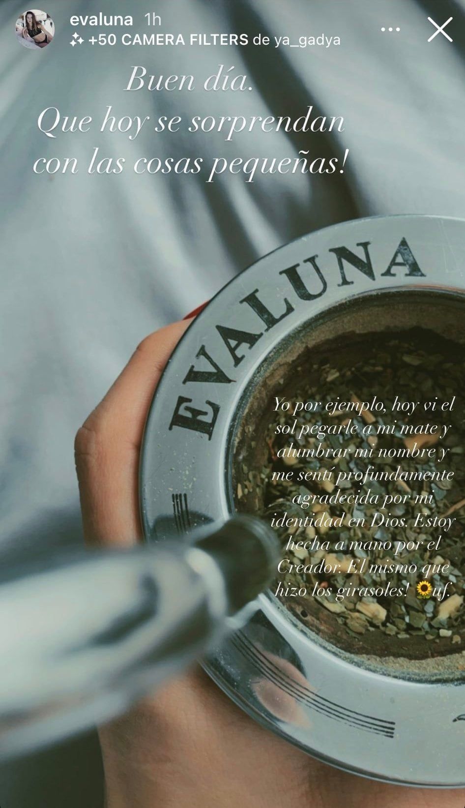 “Yo por ejemplo hoy vi el sol pegarle a mi mate y alumbrar mi nombre y me sentí profundamente agradecida por mi identidad en Dios. Estoy hecha a mano por el creador. El mismo que hizo los girasoles, uf”, sumó la joven artista.